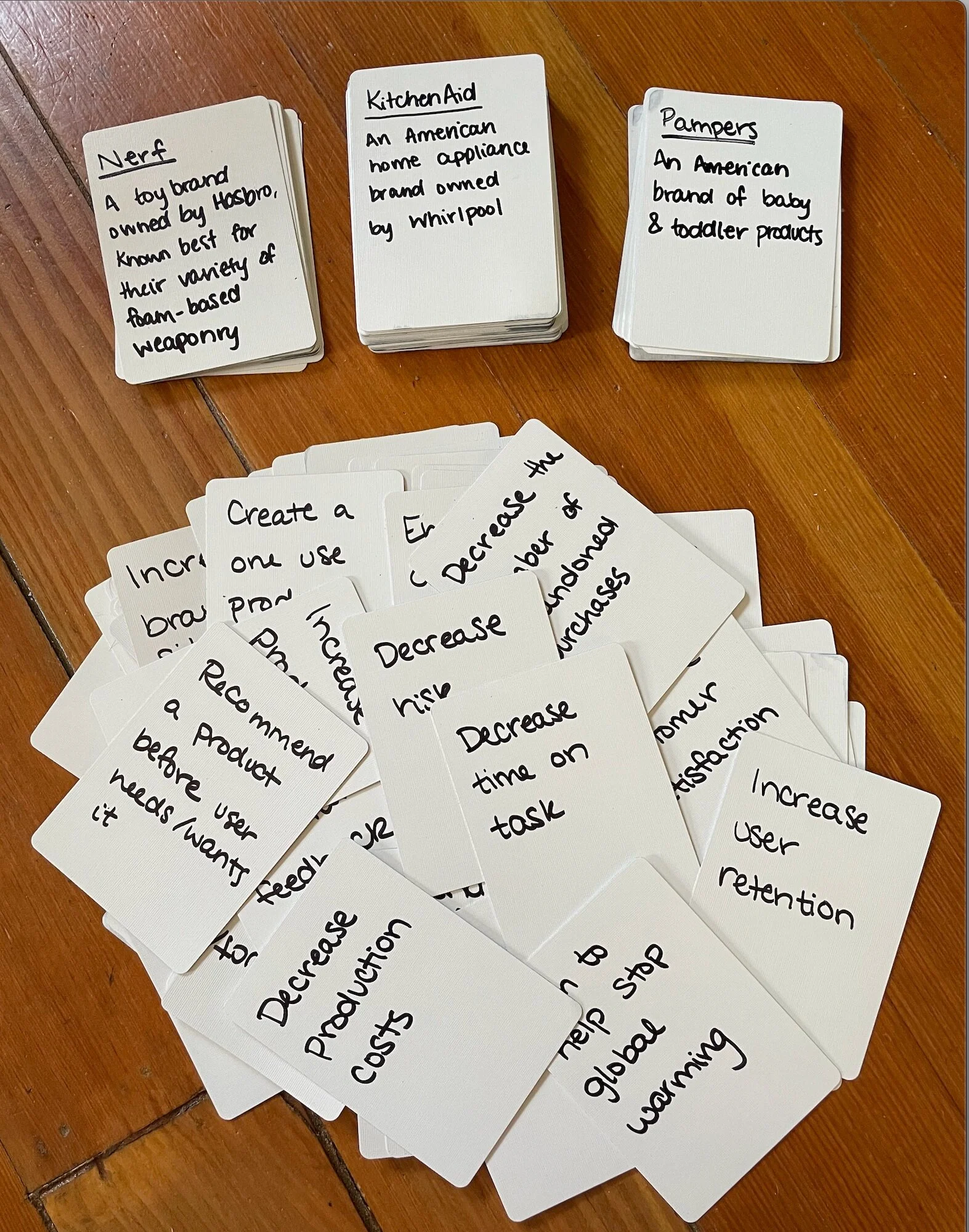 Together, with my product manager, we created our own game for ideation. One deck of 52 has a problem statement, and the other deck of 52 has a brief definition of the user motivation. Some of the cards refer to Capital One or banking problems, but most don’t! We found it important to pull people out of their comfort zones.