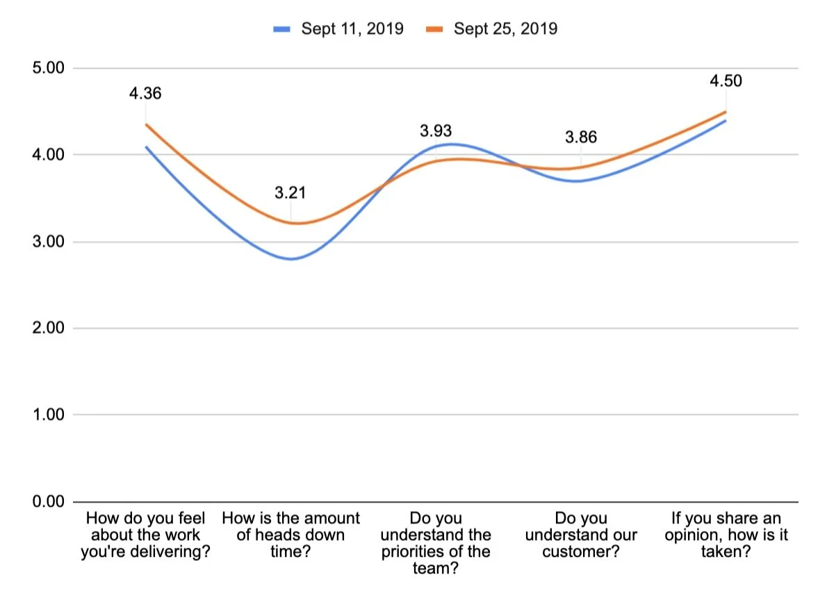 The entire team took the survey at the beginning of each retro. After retro, the team’s leads met to review retro topics and survey results. We’d then prioritize next steps, focusing on our team goals and areas for improvement.